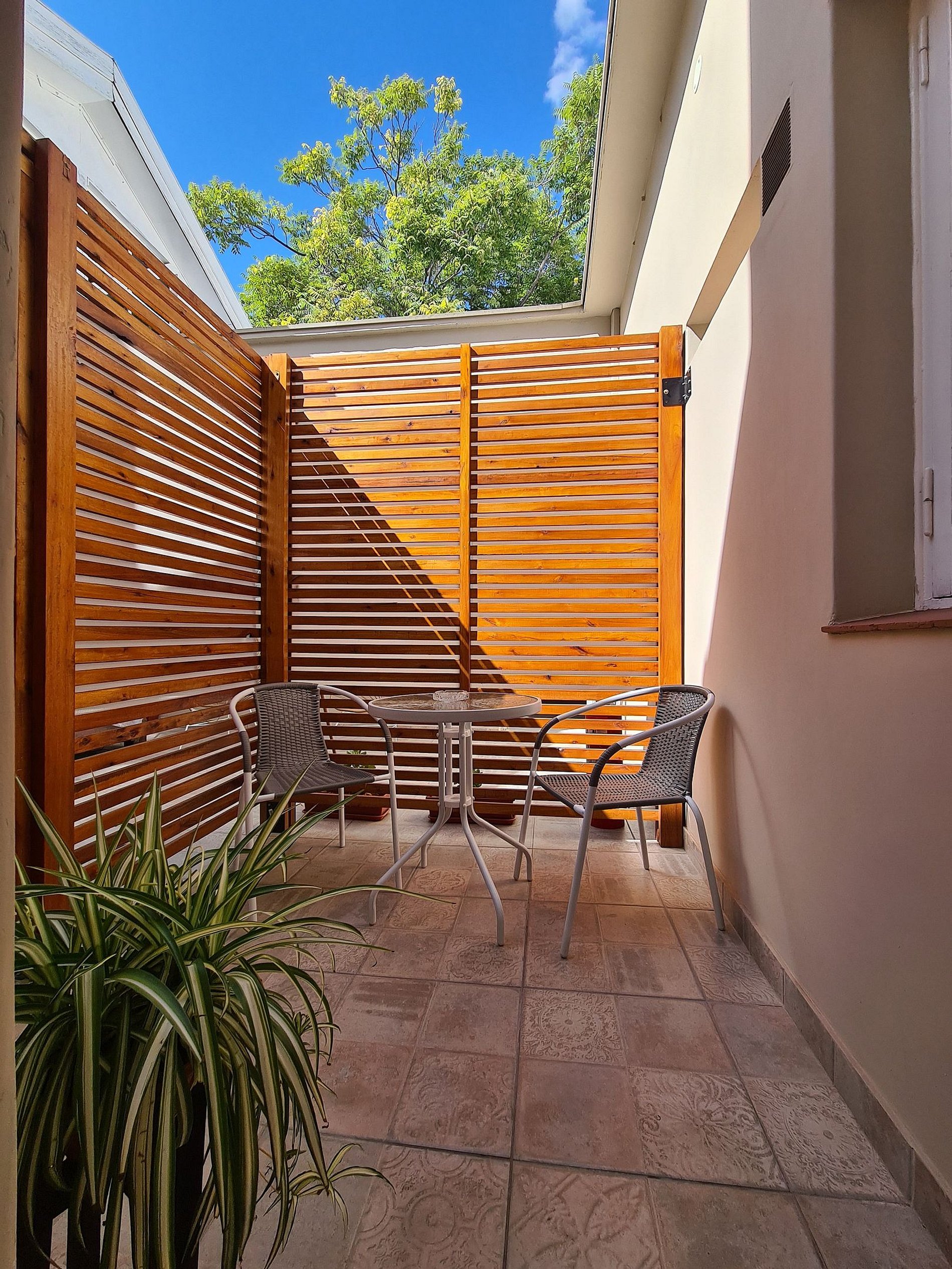 El sector que se encuentra antes del patio es un ESPACIO COMPARTIDO, es posible que hagamos uso de él durante su estadía. Puede mantener la puerta entre el departamento y este espacio con llave.